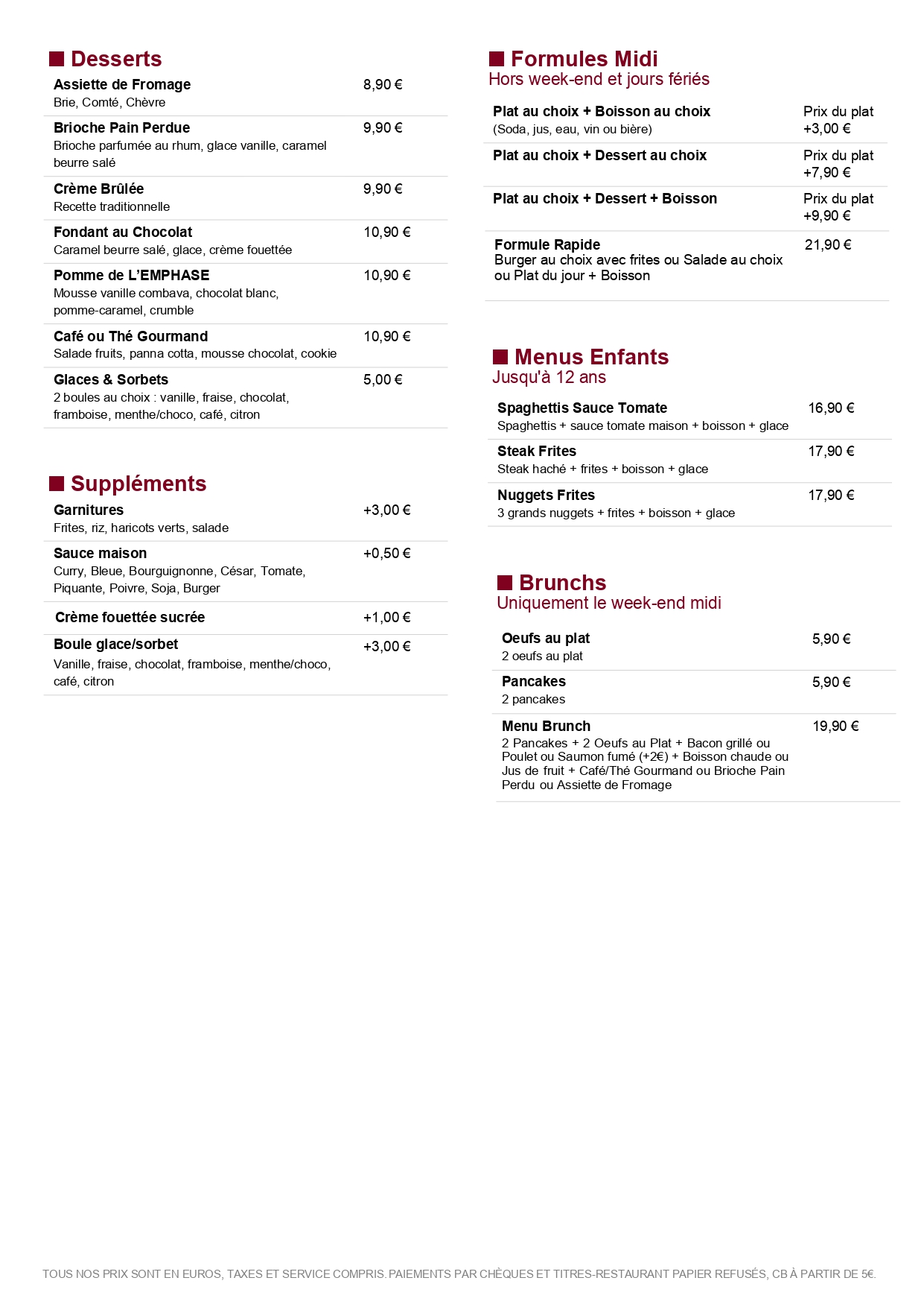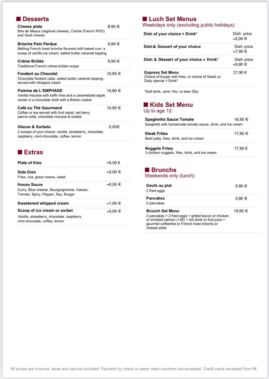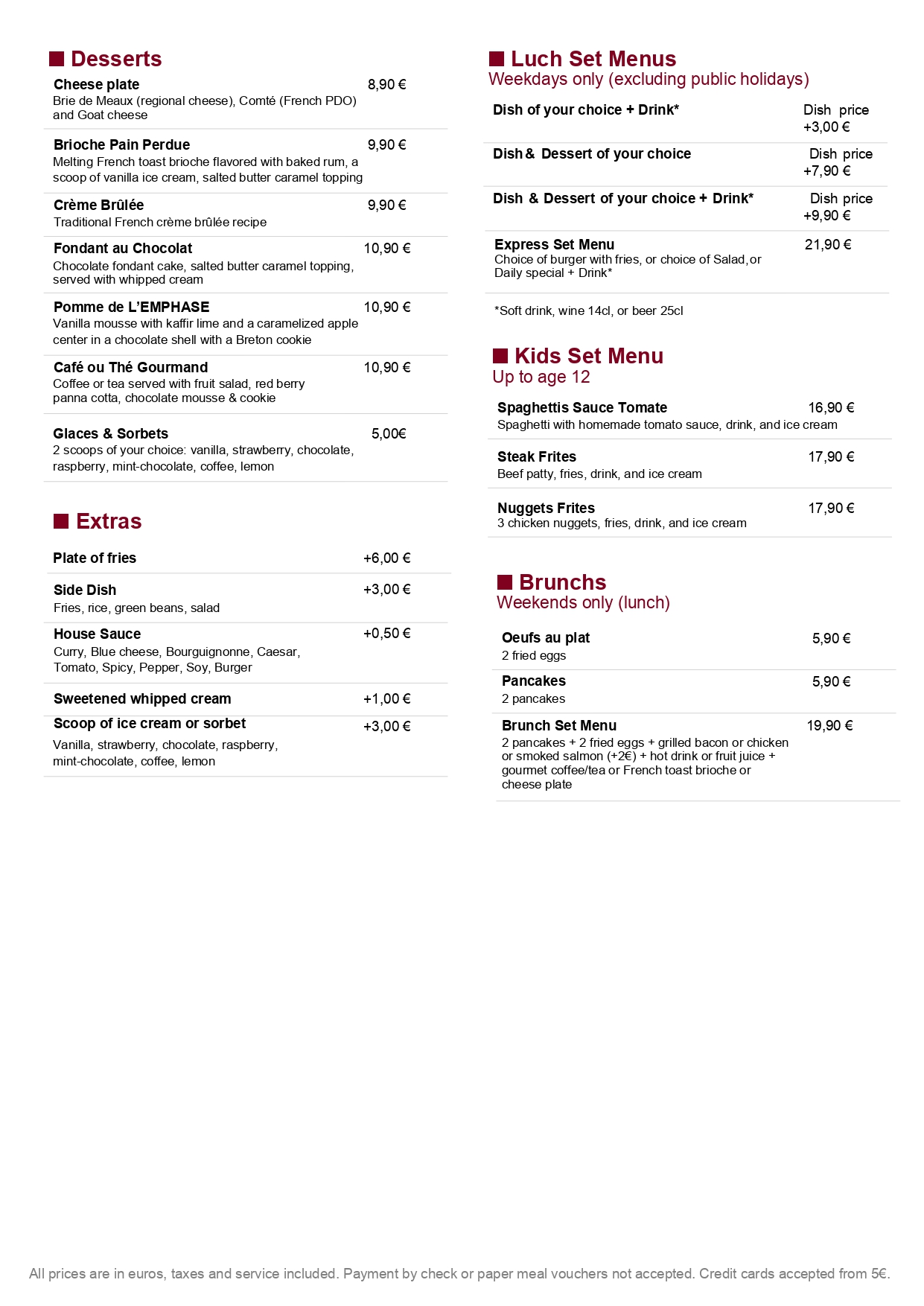 | Garnitures | Frites du Jour, Riz parfumé, Le Méli-Mélo de Salade, Garniture du moment |