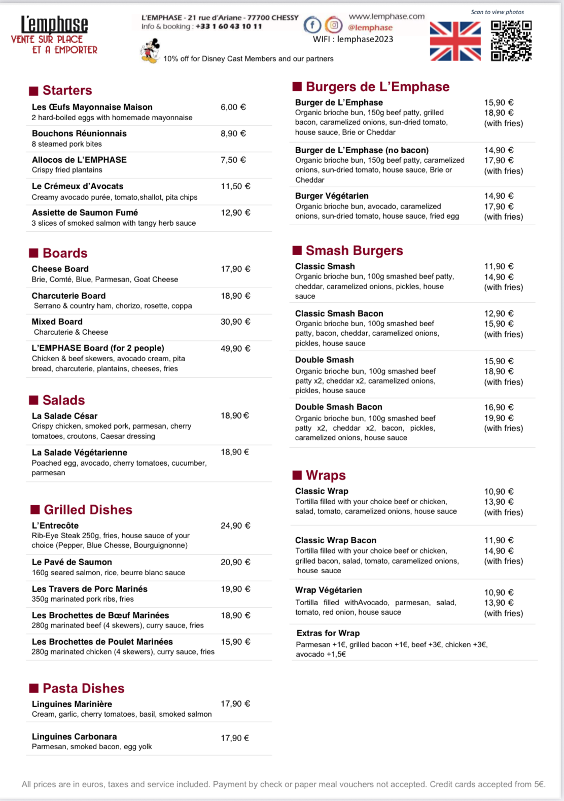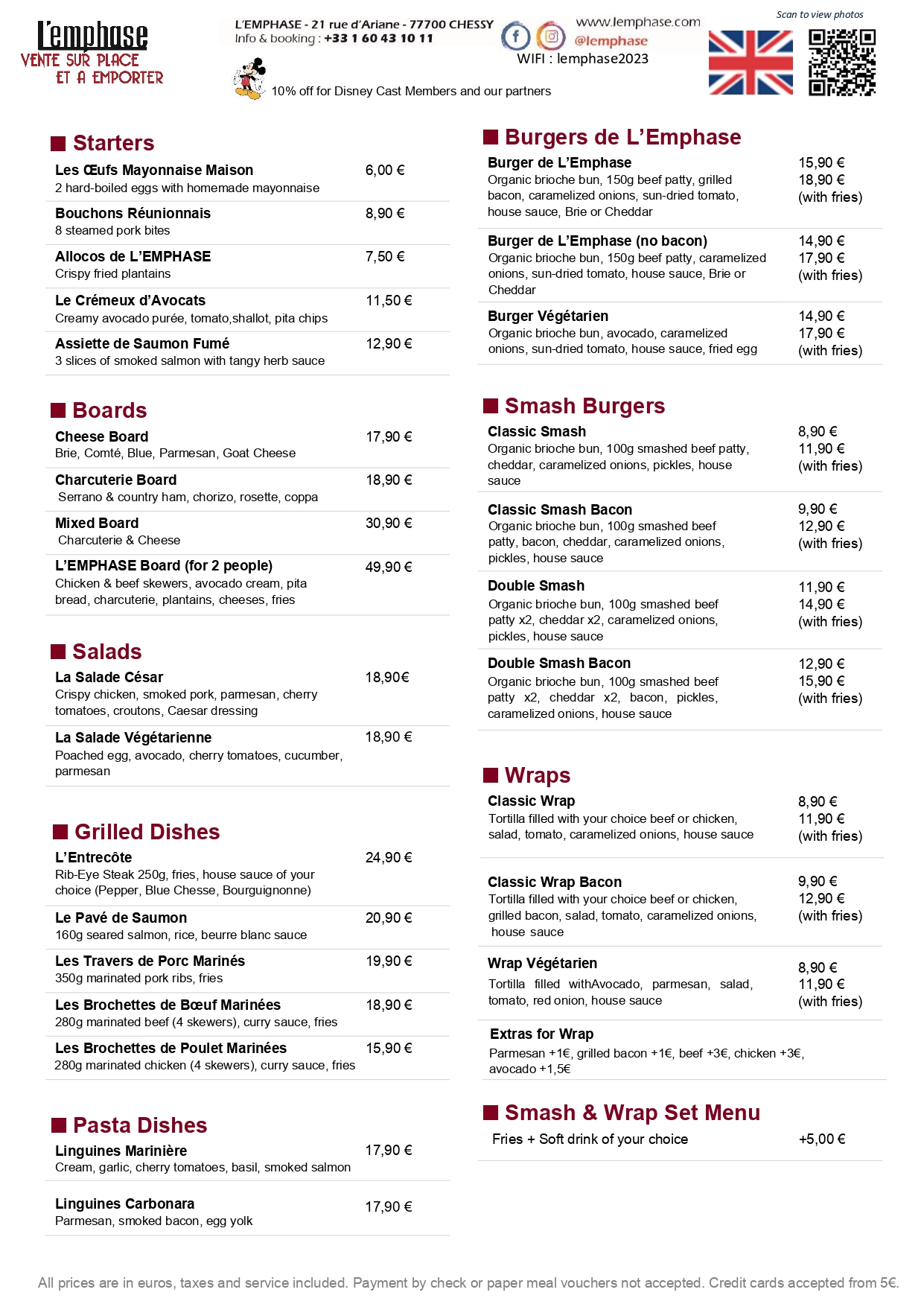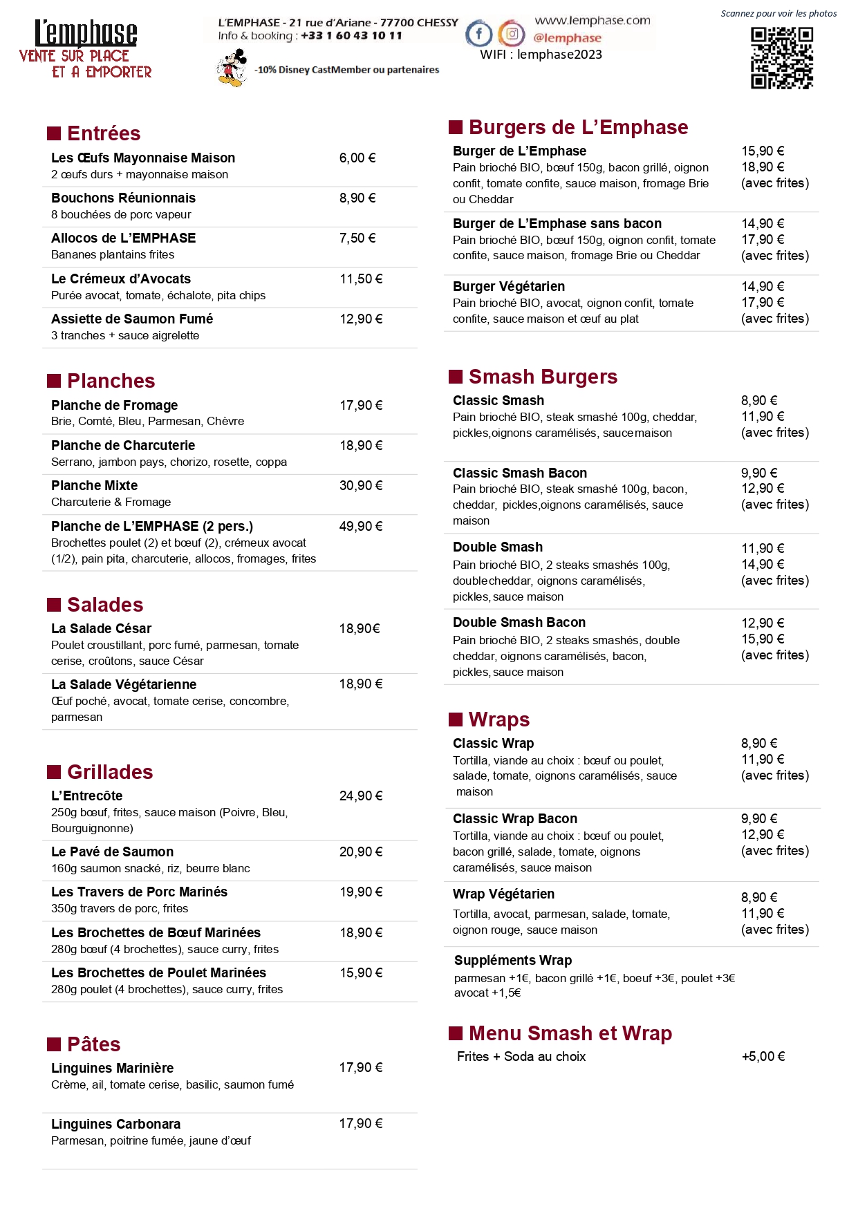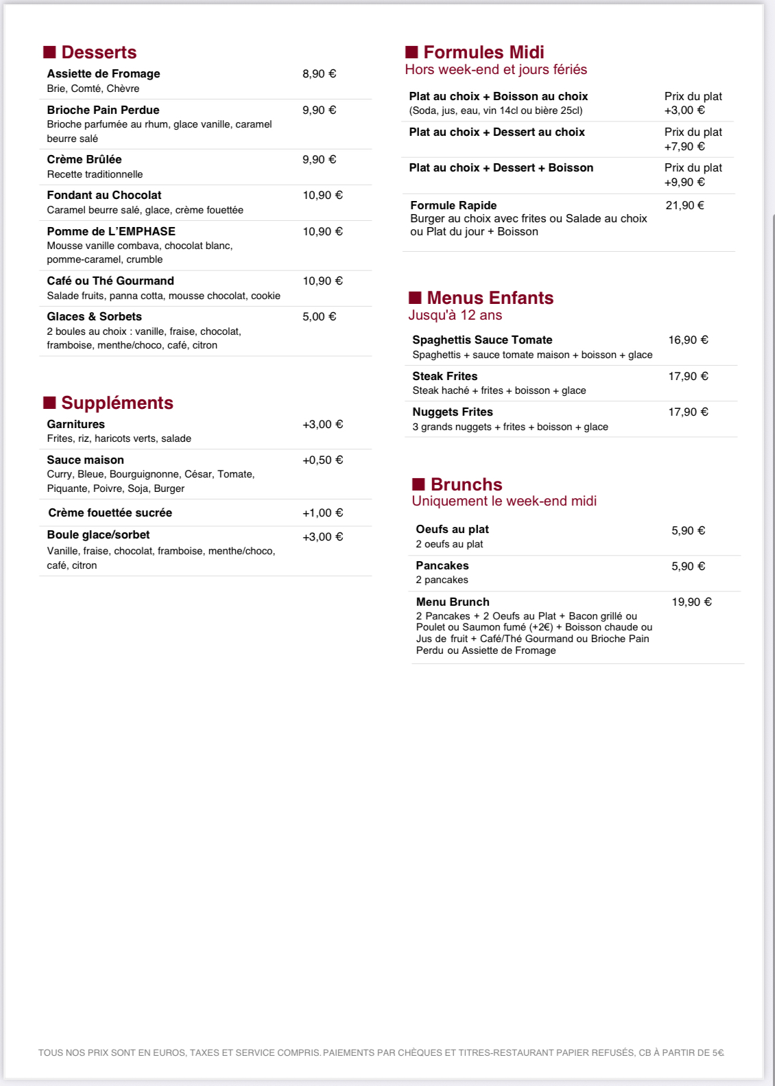 | Garnitures | Frites du Jour, Riz parfumé, Le Méli-Mélo de Salade, Garniture du moment |